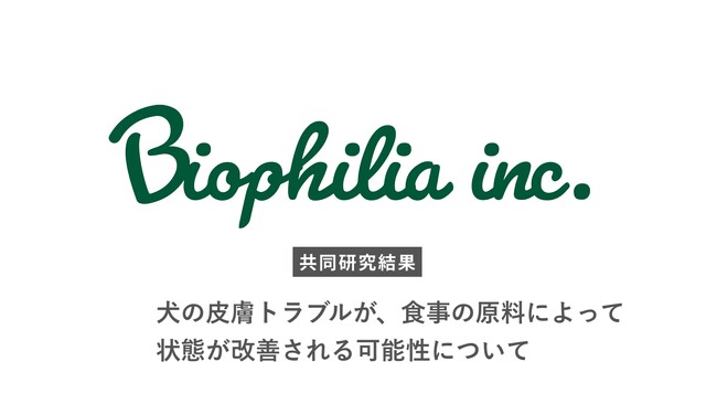株式会社バイオフィリア(本社:東京都新宿区、代表:岩橋洸太、以下:当社)は、どうぶつ健康科学研究所所長 獣医師・獣医学博士 小沼守先生と共同で、皮膚症状のある犬における、スキンケア用手作り食(以下、手作り食)の機能性について共同研究を行いました。その結果、食物アレルギーを含めた皮膚症状のある犬において、原料の関係で状態を改善させる可能性が示唆されました。