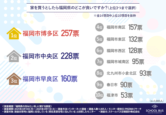 スクールバス空間設計株式会社(所在地:大阪市中央区、代表取締役:田中 将司)は、福岡に在住している方(現在賃貸住宅に住んでいる方)を対象に「福岡県の住みたい街ランキング」に関する調査を行いました。