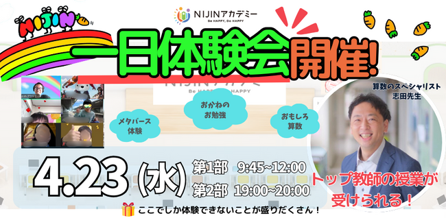 現在、NIJINアカデミーでは平日に体験説明会を開催しておりますが、4月は『トップ教師の授業が受けられる一日体験会』を開催します!