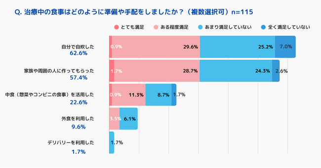 食事の準備方法については、「自炊」や「家族に作ってもらう」が主流でしたが、いずれの方法でも約半数が「満足していない」と回答しました。