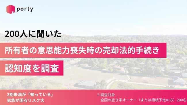 株式会社ポルティ(神奈川県川崎市、代表取締役:平 瑶平、以下「ポルティ」)は、全国の空き家オーナー(または相続予定の方)200名を対象に、「所有者が認知症などで意思能力を失った場合の空き家売却に必要な法的手続き」について調査しました。