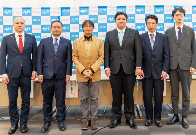 PLPスタートアップチームメンバー。写真左から、宮坂 宥憲様(公益社団法人日本青年会議所 新教育システム創造会議 議長)、遠藤 太一郎(株式会社カナメプロジェクト 取締役CEO/東京学芸大学 教授)、金子 嘉宏様(東京学芸大学 教授/教育インキュベーションセンター長)、外口 真大様(公益社団法人日本青年会議所 会頭)、中村 尊様(NPO法人フリースクール全国ネットワーク 代表理事)、岡部 悟志様(ベネッセ教育総合研究所 主任研究員) ※2025年4月7日に青年会議所会館にて実施したPLP記者発表会にて撮影