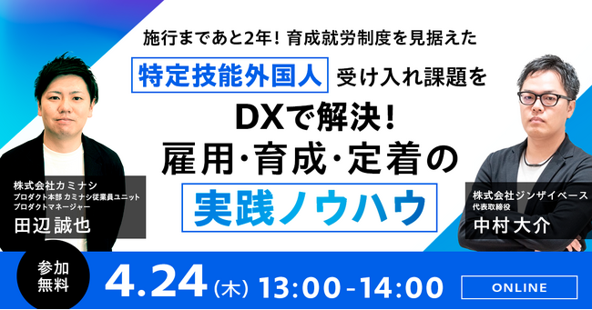 外国人材の紹介・採用コンサルティングを展開する株式会社ジンザイベース(本社:東京都千代田区、代表取締役:中村 大介、以下「ジンザイベース」)は、現場DXプラットフォーム『カミナシ』シリーズを提供する株式会社カミナシ(本社:東京都千代田区、代表取締役:諸岡 裕人、以下「カミナシ」)と共同で、『施行まであと2年!育成就労制度を見据えた特定技能外国人受け入れ課題をDXで解決!雇用・育成・定着の実践ノウハウ』と題したウェビナーを2025年4月24日(木)13:00に開催いたします。