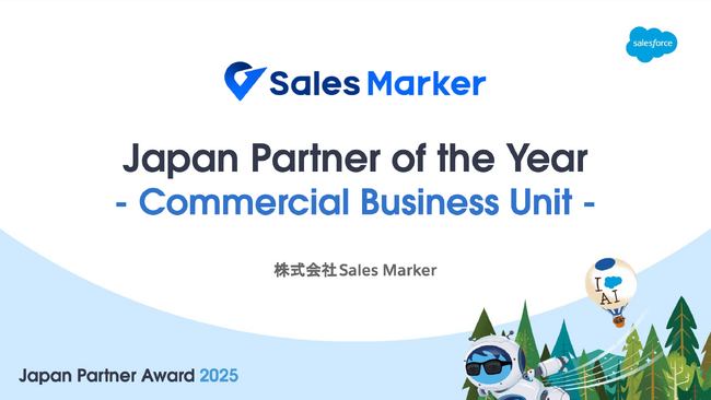 国内初※1「顧客起点」でおこなう新時代の営業手法「インテントセールス」を実現する『Sales Marker(セールスマーカー)』を開発・提供する株式会社Sales Marker(本社:東京都渋谷区、代表取締役 CEO:小笠原 羽恭、以下:当社)は、Salesforce Japan Partner Award 2025における「Japan Partner of the Year - Commercial Business Unit」を受賞しました。Commercial Business Unit との協業実績で特に秀でた実績が評価され、授与されたものです。
