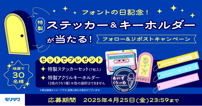 株式会社モリサワ(代表取締役社長:森澤彰彦 本社:大阪市浪速区敷津東2-6-25 Tel:06-6649-2151 代表、以下モリサワ)は、4月10日の「フォントの日」を記念し、2025年4月10日(木)~2025年4月25日(金)の期間、特製ステッカーとキーホルダーがセットで当たるフォロー&リポストキャンペーンを実施します。