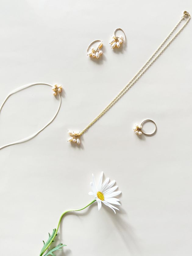 ゆらぎのある形状の5粒のパールは、まるでさりげなく咲く可憐なお花のように、どなたのお手元へも自然と馴染みつつも控えめな存在感で輝きを放ちます。