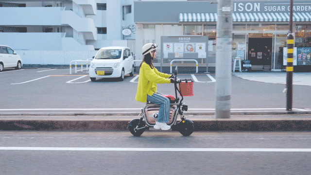 シニアも両足が地面にベタ足で着いて安心。荷物も沢山つめて、パワフルでキュートな電動原付一種 PONY2