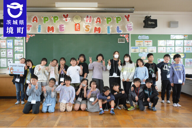 「English Camp」の初日には、「すべての子どもが英語を話せる町」を目指し、保育園や小中学校における英語教育(スーパーグローバルスクール事業)に取り組む境町の境小学校児童が利用する「にこにこ児童クラブ」3年生14名と「学童交流in English」を実施しました。