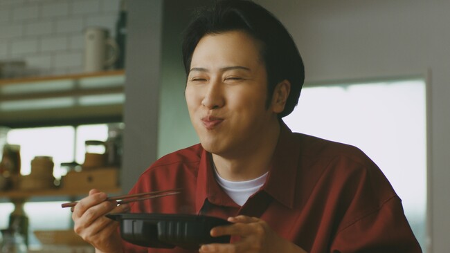 歌舞伎俳優の尾上松也さんが、同シリーズの「ふっくらごはんと豚肉生姜焼き」をレンジで調理後に頬張って満足するようすを描き、絶品おかずと釜炊き白ごはんのおいしさを訴求します。テレビCMの投入により商品の認知拡大を図り、食卓での利用機会を促します。