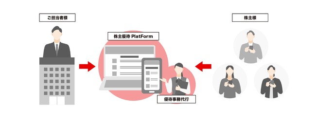 まず株主優待制度を行う上場企業が、本サービスを通じ株主の保有株数や保有期間、利回りなどの情報を参考に優待内容についてのシミュレーションを実施し、優待制度の登録や申込サイトの表示設定を行います。株主は申込サイトにパソコンやスマートフォンでアクセスし、優待品を申込みます。申し込んだ優待品は申込サイトから受取り利用できます。