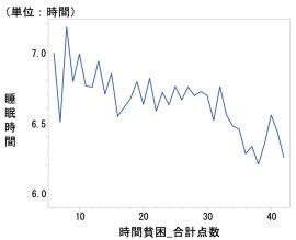平日の睡眠時間が7時間を下回ると、時間貧困指標の合計点数(6~42点)が高くなる(時間が足りないと強く感じる)傾向が確認されました。