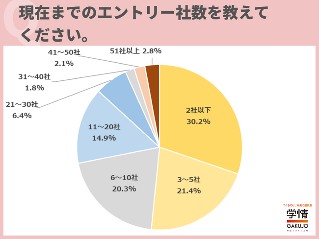 エントリー社数について、「2社以下」と回答した学生が30.2%で最多でした。「3~5社」21.4%、「6~10社」20.3%と続き、「10社以下」が計71.9%に上りました。「行きたい会社があり、そこに集中したいため、たくさんは受けたくない」「志望業界や職種を明確に絞り込み、自分に合った企業を慎重に選んで応募している」「条件に合うところにエントリーしたい」などの声が寄せられました。