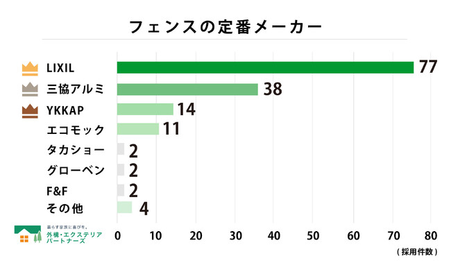 最も多く採用された商品はLIXILの「フェンスAB」で37件、次いで同じくLIXILの「ハイグリットフェンス」が32件となりました。特にフェンスABはシンプルながら高い目隠し性能を備えており、デザインと機能のバランスが支持を集めています。また、三協アルミの「ユメッシュフェンスE型」(21件)やエコモックの「オリジナルフェンス」(9件)なども一定の採用実績が見られ、多様なニーズに応える製品が評価されている様子がうかがえます。