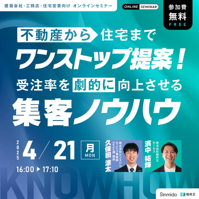 工務店様特化で集客支援を提供する株式会社シンミドウ(本社:埼玉県さいたま市)は、不動産仲介を行う株式会社物件王様(本社:愛知県名古屋市)と共催にて、無料オンラインセミナーを行います。