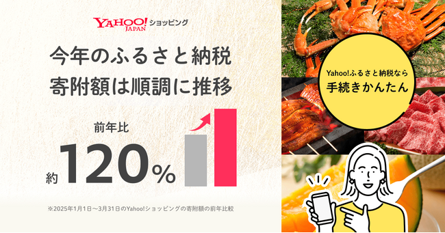 今年1月~3月のYahoo!ショッピングのふるさと納税は、前年同期比120%の寄附額に