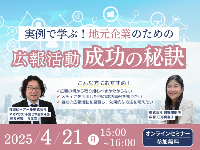 株式会社城野印刷所(本社:熊本県上益城郡益城町、代表取締役社長:城野斉、以下、当社)は、2025年4月21日(月)にオンラインセミナー「実例で学ぶ!地元企業のための広報活動 成功の秘訣」を開催します。
