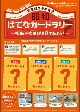 参加方法:①京王線や昭和にまつわるはてなを記載した「はてなカード(3カ所×3種類 全9種類)」・「はてなカード台紙」を設置した全3カ所の「はてなカードラック」から、1種類ずつはてなカードを集め、はてなカード台紙に収めます。