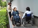 スロープを実際車いすで利用してみると慣れない傾斜に戸惑い、離合した際の圧迫感を実感。