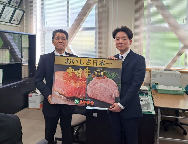株式会社ミヤチク(本社:宮崎県都城市/代表取締役社長:船ヶ山 祐二)は、入賞の祝福と共に、宮崎県立高鍋農業高等学校へ畜産農家の若手育成応援と地域社会貢献の一環として、出品された宮崎牛を贈呈いたしました。