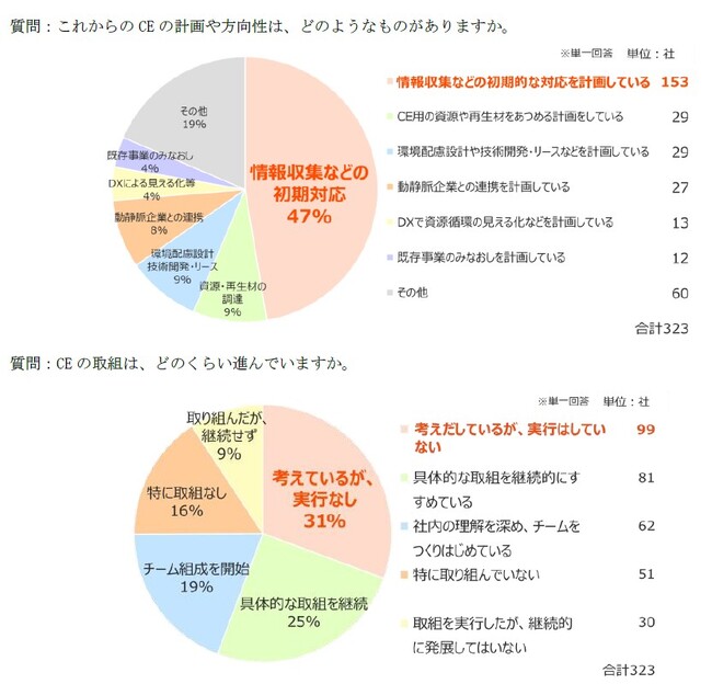 CE推進に向けて、回答企業の47%が「情報収集など初期対応を計画している」と回答し社内調整や体制整備、事業検討などの計画策定にとどまっています。一方で、すでに「具体的な取組を継続的にすすめている」と回答した企業も25%あり、今後の進展が注目されます。