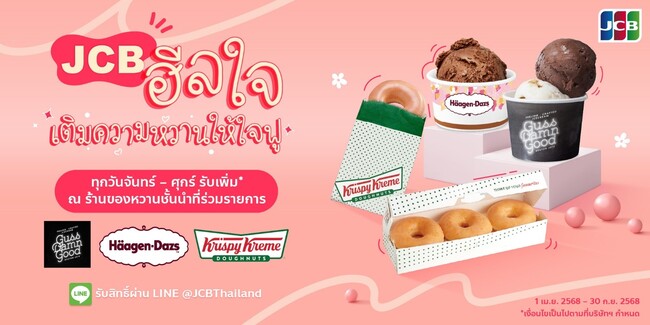 今回、バリューデザイン(タイ)とJCBは、バリューデザインのサービスを導入するハーゲンダッツ、Guss Damn Good、クリスピー・クリーム・ドーナツへの店舗送客、タイにおけるJCBカードの利用促進を目的に「JCB heal jai」キャンペーンを実施します。期間中、JCBカードでの決済、条件を達成すると、対象ブランドの商品と交換できるデジタルクーポンをプレゼントします。なお、本キャンペーンの実施にあたりバリューデザイン(タイ)では、店舗に対してデジタルクーポン発行や販促物の作成、精算業務などをサポートしています。