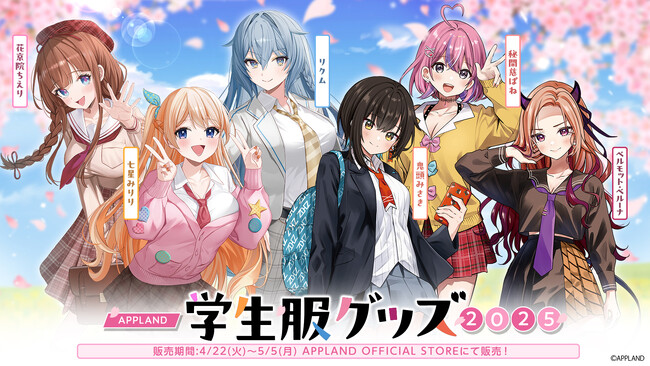 『APPLAND 学生服グッズ 2025』に関して、当社が運営する公式グッズ販売サイト(APPLAND OFFICIAL SHOP)にて2025年4月22日(火)より販売スタート!花京院ちえり、七星みりり、リクム、鬼頭みさき、秘間慈ぱね、ベルモット・ベルーナの描き下ろしグッズが5種類登場!個性溢れる6人との学生生活を感じられる本グッズをお買い逃しなく!