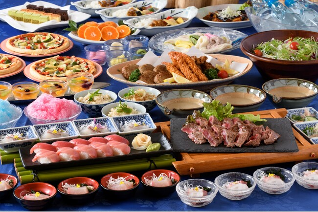 上記の食材をふんだんに使用した愛情たっぷりなビュッフェとなります。愛媛ブランドの媛スマは握り寿司でご用意。その他にも、瀬戸内海や宇和海産の新鮮な魚のお造りやカルパッチョ、豊かな自然の中で育てられた国産牛のステーキ、そして温暖な気候と西日本最高峰の「石鎚山(いしづちさん)」の伏流水で育てた地元野菜やフルーツ・デザートなど「柑橘王国えひめ」ならではの食材がならびます。ご当地グルメも充実、愛媛の魅力を存分に味わっていただけるビュッフェです。