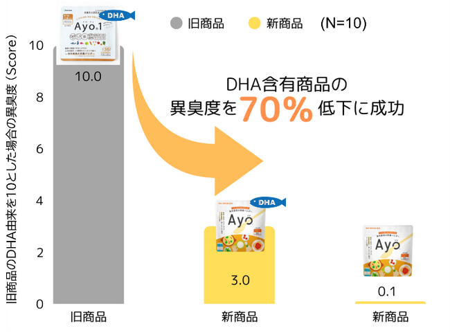 特にDHA配合タイプ「Ayo(R)1」は、DHAを手軽に補えることから高い支持を得てきましたが、一部のお客様から「魚の匂いが気になる」といった声が寄せられていました。そこで当社が製造工程で生じるDHA匂いを抑える手法の開発に取り組んだ結果、旧商品と比較して匂いを約70%低下(図1)することに成功し、今回のリニューアルに至りました。