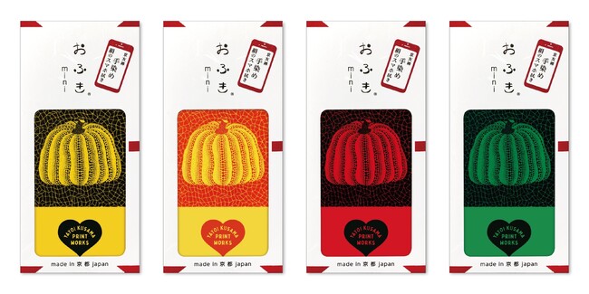 本企画でしか入手できないスマホ拭き「おふきmini」は、草間彌生さんの《南瓜》を京友禅職人が絹素材に手染めで丁寧に制作した逸品です。