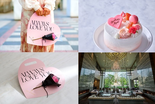 “ハートフラワーギフトバッグ”と“母の日メッセージ入りホールケーキ”が付いた母の日プランを販売
