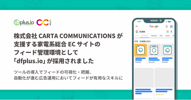 株式会社フィードフォース(所在地:東京都港区、代表取締役:塚田 耕司、以下「フィードフォース」)が提供するデータフィード管理ツール「dfplus.io」が、株式会社CARTA COMMUNICATIONS(所在地:東京都港区、代表取締役社長:目黒 拓)が支援する家電系総合 EC サイトで導入されました。