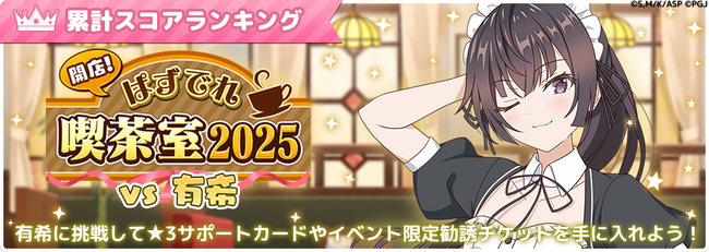 4月24日(木)よりイベント「開店!ぱずでれ喫茶室2025 累計スコアランキング VS有希」を開催します。当イベントは、期間中の累計スコア順位に応じたランキング報酬が獲得可能です。またイベントマップで集めたポイントで、イベント限定のサポートカードやアイテムが獲得できる「ポイント交換所」も登場。繰り返し挑戦してよりたくさんのポイントを集め☆3サポートカードや勧誘チケットを手に入れよう!