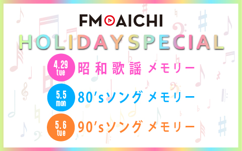 5月6日(火・振休)のこの日は6:00から19:30まで、「FM AICHI HOLIDAY SPECIAL ~90’sソングメモリー~」をお届け。CDセールス全盛期の90年代の懐かしいサウンド満載。前日と同様、各番組Xでの楽曲投票企画も実施していきます。