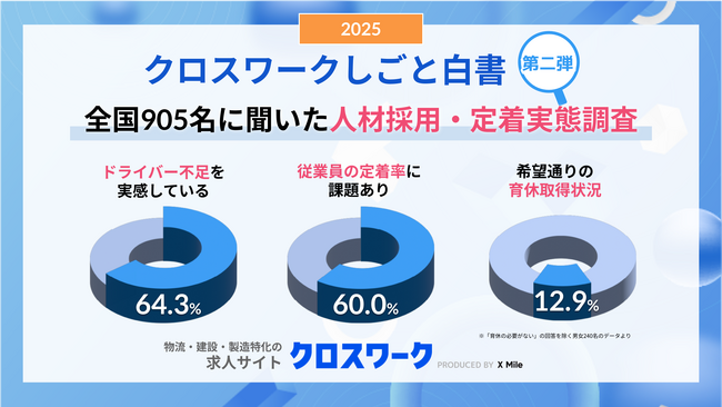 ノンデスク事業者向けの人材採用システム『クロスワーク』を提供するX Mile株式会社(読み:クロスマイル、本社:東京都新宿区、代表取締役:野呂 寛之、以下『当社』)は、物流業界の働き方に関する実態調査「クロスワークしごと白書2025」の第二弾として、『物流業界の人材採用・定着課題編』をこの度、発表しました。本調査は、全国の物流事業の経営者・役員185名と、トラックドライバー720名(*)の計905名を対象に、物流業界における採用・定着・働き方の現状を可視化しました。結果からは、法改正や制度整備だけでは解決できない、“現場と経営の意識のギャップ”が浮き彫りとなりました。なお、第一弾では、『物流2024年問題』による収入・働き方の変化および、2025年4月1日より施行の『物流関連二法』への対応策に関する調査結果をまとめておりますので、あわせてご覧ください。