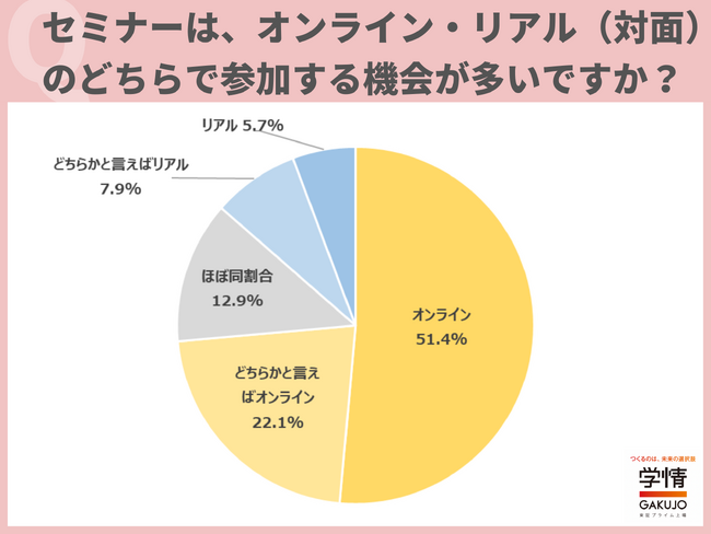 時間や場所を選ばずに参加可能なWebセミナーやWeb面接は、コロナ後も定着し、学生・企業ともにオンラインとリアルを併用した就職・採用活動を行っています。学生はセミナー参加の際、オンラインとリアルのどちらを選択することが多いのかアンケートを実施しました。