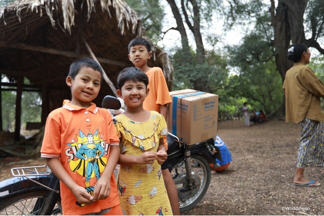 ワールド・ビジョンから高エネルギービスケットを受け取るミャンマーの被災地の子どもたち