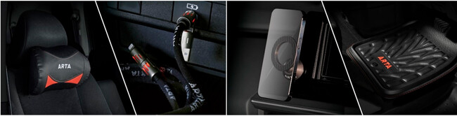 快適な乗り心地をサポートするクッションや、レーシングタイヤを彷彿とさせるトレッドパターン調のフロアマット、重厚感のあるスマホスタンドをはじめとするガジェット類など、ARTAが表現する「タフで非日常」な世界観をトータルコーディネートで楽しめるラインアップです。