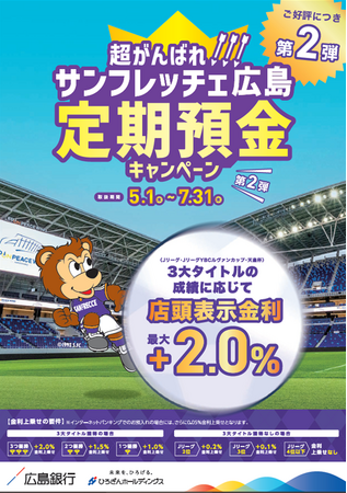 株式会社広島銀行(頭取 清宗 一男)では、2025年1月27日(月)から2025年3月31日(月)まで実施した「超がんばれ!!!サンフレッチェ広島定期預金キャンペーン」が多くの皆さまにご好評をいただきました。これを受け、サンフレッチェ広島のさらなる活躍の後押しと地域の活性化に貢献するため、第2弾の定期預金キャンペーンを実施しますので、下記のとおりお知らせいたします。
