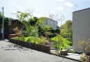 庭の最上部には、妻S様の駐車場を。S字型の丘の小道を楽しみながら降りられるようにと、あえて玄関から離れたところに作りました。「仕事から帰り、枕木の階段をピアノを弾くように降りながら木との会話を楽しんでいます。近隣の方と話す機会も増えました。街の散歩コースになって皆さんに喜んで頂けているようです。夜にライトアップもしているので、通勤帰りの方々にも楽しんでもらっています。」と楽しそうに話す妻のS様。