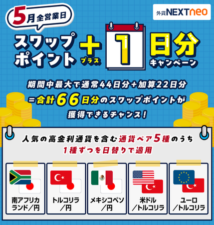 株式会社外為どっとコム(本社:東京都港区、代表取締役社長:竹内 淳)は、店頭FX『外貨ネクストネオ』におきまして、2025年5月1日(木)より「5月全営業日スワップポイント+1日分キャンペーン」を実施します。