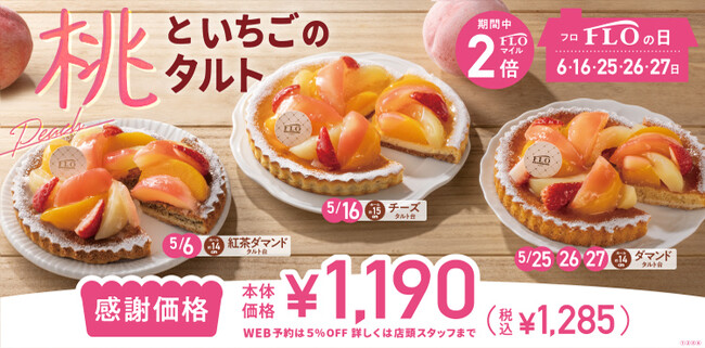 FLO<フロプレステージュ>では、季節のフルーツを使用したお得なタルトとFLOの人気商品を多くのお客様にお楽しみいただきたく、毎月6日・16日・25~27日の計5日間※を「FLO<フロ>の日」として、お手頃価格の商品をご用意しております。