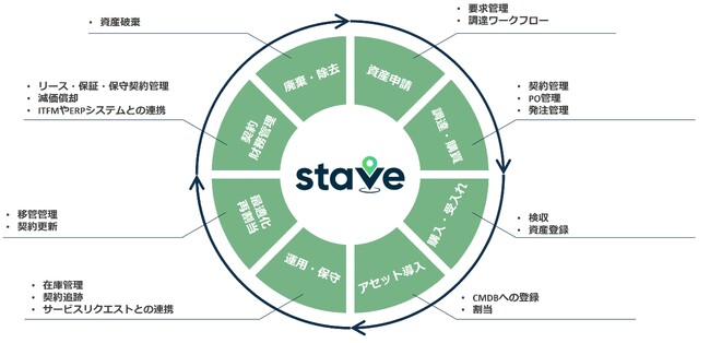 今回の提携により、資産の企画・調達・展開から、運用・契約管理・廃棄に至るまでのライフサイクル全8フェーズを、単一の統合プラットフォーム上で支援する「Stave」ソリューションの共同提供を開始します。