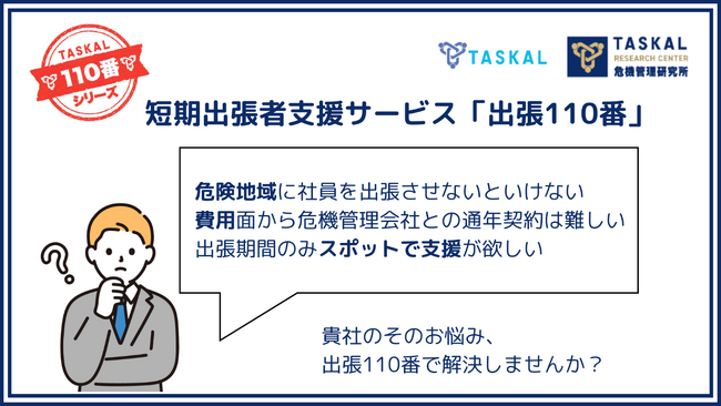 株式会社日本旅行(本社:東京都中央区、代表取締役社長:小谷野悦光)の海外グループ会社である TASKAL RESOURCES SDN. BHD.(本社:マレーシア クアラルンプール、代表取締役社長:壁田忠幸、以下「当社」)は、日本からの短期海外出張者を対象とした危機管理サービス「出張110番」の提供を開始しました。