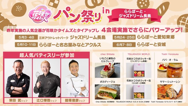 CBCテレビで毎週土曜朝9時25分から放送中の「なるほどプレゼンター!花咲かタイムズ」が、三井不動産商業マネジメント株式会社が運営する三井アウトレットパーク ジャズドリーム長島、三井ショッピングパーク ららぽーと名古屋みなとアクルス、ららぽーと愛知東郷、ららぽーと安城の4施設とタイアップして、『花咲かタイムズパン祭りinららぽーと・ジャズドリーム長島』を開催します!
