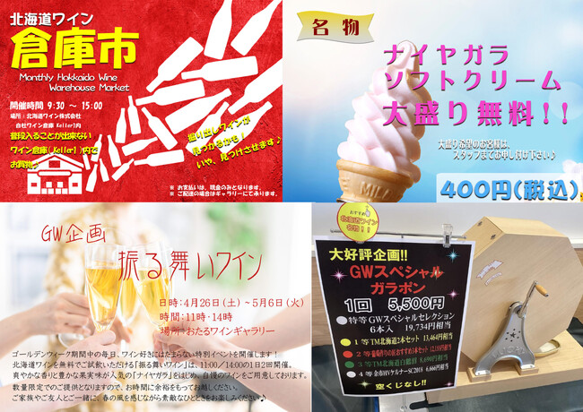 【北海道ワイン】おたるワインギャラリーGW企画~ソフトクリーム大盛やワインの無料試飲、お得な倉庫市を開催中 ~
