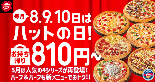 ピザハットでは、毎月8日・9日・10日を「ハットの日」として、毎月変わる対象商品をお持ち帰り810円~でご提供しています。また、「ハットの日」対象商品をご注文いただくと、さらにサイドメニュー3種類も特別価格でお楽しみいただけるという、とってもおトクな3日間です!