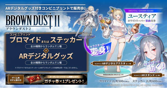 「ブラウンダスト2」のキャラクターたちが、BGMにのせて「変身する、動き出すARデジタルスタンド付きブロマイド・ステッカー(ゲームで使用できる「ガチャ券クーポンコード付き」)」を発売!