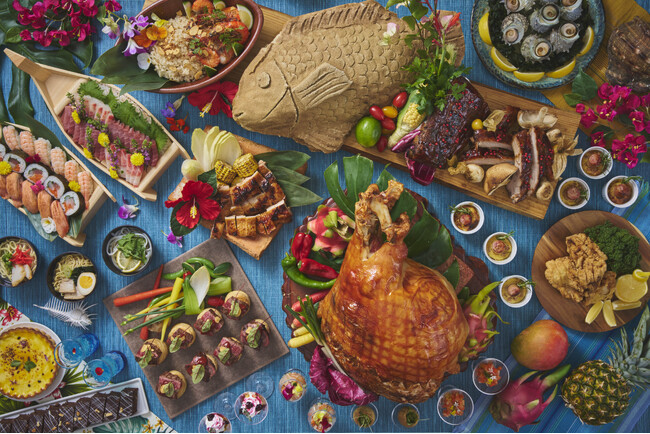 沖縄の風味とハワイのエッセンスが融合した豪華なディナービュッフェで、南国の味覚を心ゆくまでお楽しみください。沖縄宮廷料理 豚肉の黒胡麻蒸しミヌダルやハワイアンガーリックシュリンプなど、沖縄とハワイを感じる料理が一堂に揃い、特別なフェアならではのコラボレーションがレストランに広がります。