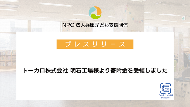 認定NPO法人兵庫子ども支援団体(所在地:兵庫県明石市、代表理事:多田実乘、以下「当法人」という)はこのたび、トーカロ株式会社 明石工場様(所在地:兵庫県明石市)より寄附金をいただいたことをお知らせいたします。同社からの寄附は2023年より3度目の受領となります。頂いた寄附金は、当法人が実施する学習支援や子どもの居場所づくり、体験活動、物品支援の提供のために使わせていただきます。