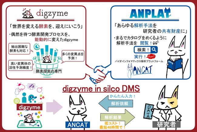 アンプラットでは、データ解析ができる人材が研究の現場で不足し、研究が滞っていたり、高額な解析外注によって困っている研究室や研究チームが多く存在している現状を打破するため、専門的なコンピューティング技術の知識が無くても研究者自身が簡単に解析を実行できるプラットフォーム「ANCAT」を開発、運営してきました。今回の協業は、両者に共通している高度なバイオインフォマティクス技術を融合し、更に、アンプラットの高いITスキルを用いた「一般化力」とdigzymeの「酵素探索の専門性」を掛け合わせることで、digzyme社のミッションでもある「世界を変える酵素を、迎えに行こう。」を実現するソリューションのひとつとして開始した試みです。